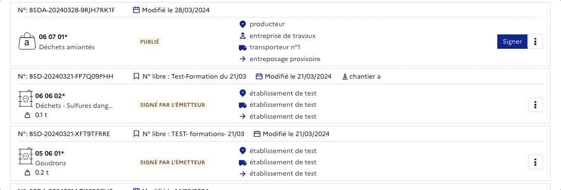 * **Le bordereau a été signé par au moins de acteur** *(Statut : Signé par l'entreprise de travaux ou signé par le Transporteur) :*