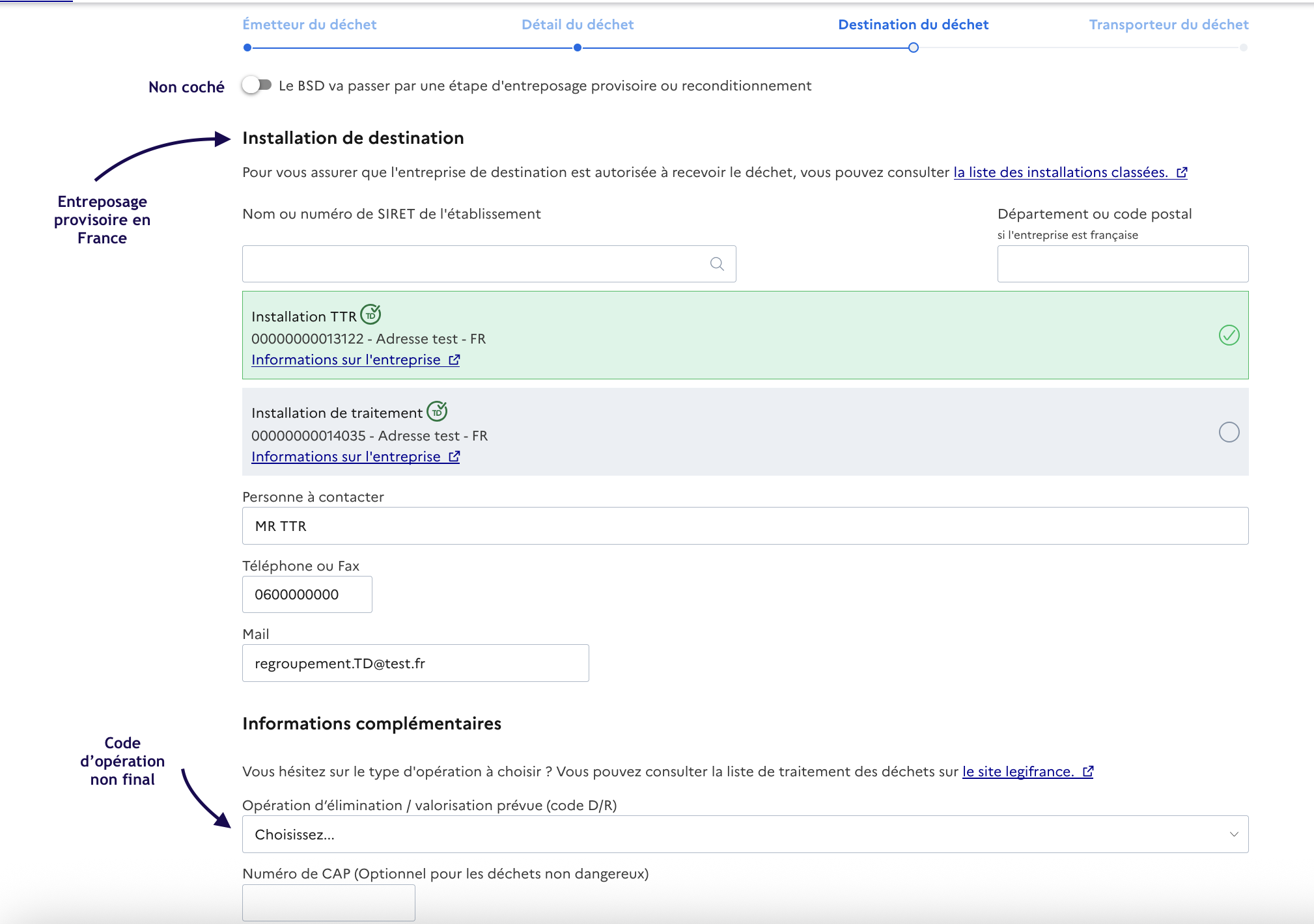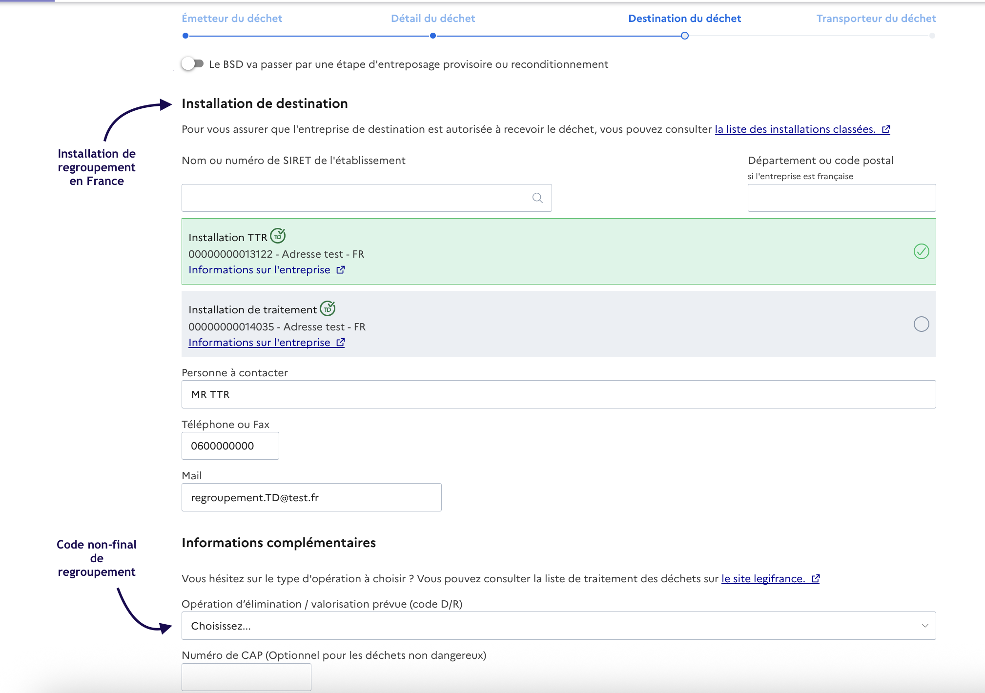 Dans ce cas, l'installation réalisant le regroupement en France doit être visée dans l'onglet *Destination du déchet* du BSDD :&#x20;