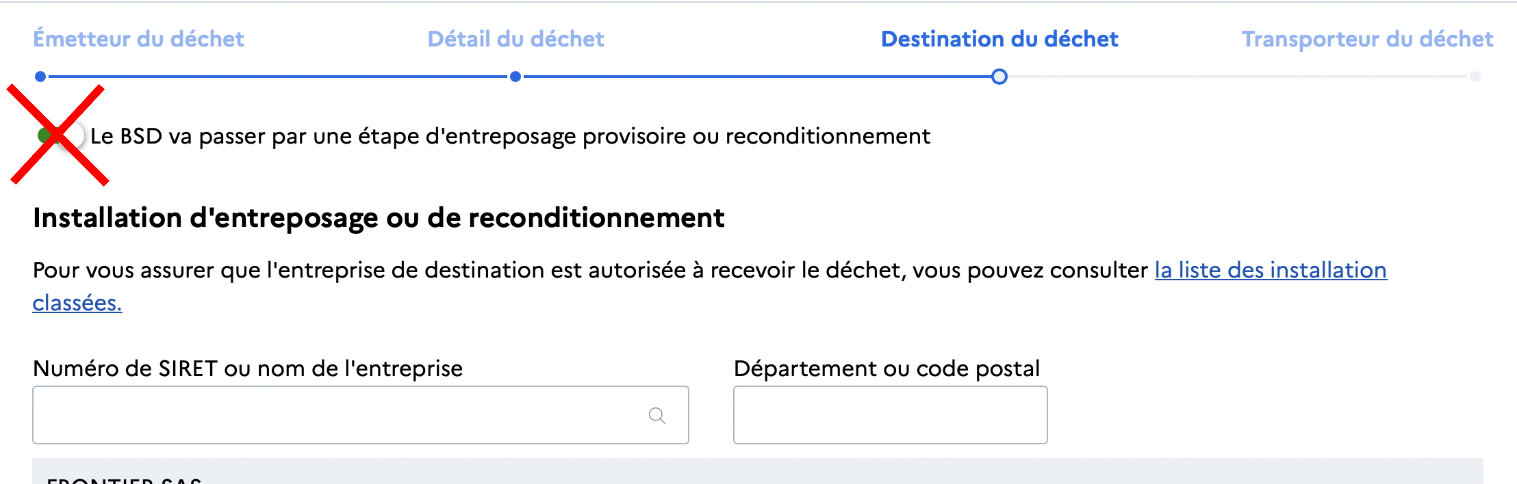 Dans ce contexte, le bouton **« Le BSD va passer par une étape d’entreposage ou de reconditionnement »** ne doit pas être utilisé.