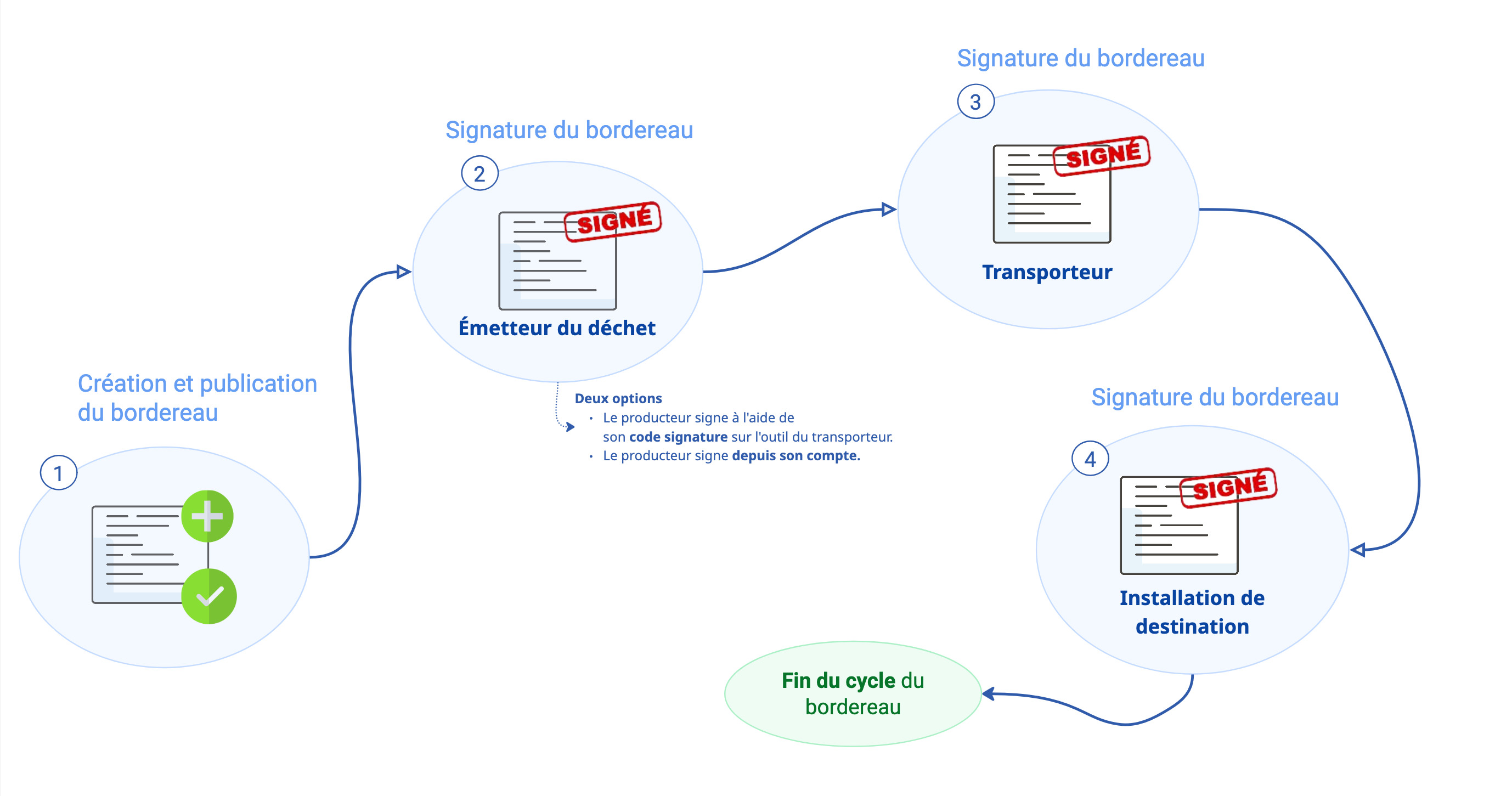 <figure><img src="https://3541271879-files.gitbook.io/~/files/v0/b/gitbook-x-prod.appspot.com/o/spaces%2F-LxvsKxFp7Zrlj5ZHerw%2Fuploads%2FeQ2INqlPg5V5mCEyfcK0%2Fbsdd.jpg?alt=media&#x26;token=c3d14ef3-bfb0-41c2-b8c7-c8d1bf1596b0" alt=""><figcaption><p>Le parcours d'un BSDD simple <em>(sans étape de tri, transit &#x26; regroupement)</em></p></figcaption></figure>