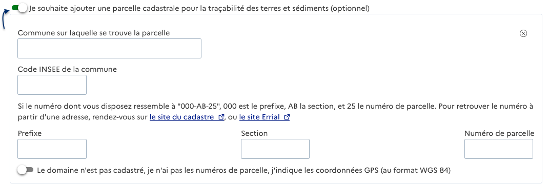 Il n'est pas possible de renseigner à la fois des coordonnées GPS et un numéro de parcelle. C'est l'un **ou** l'autre.