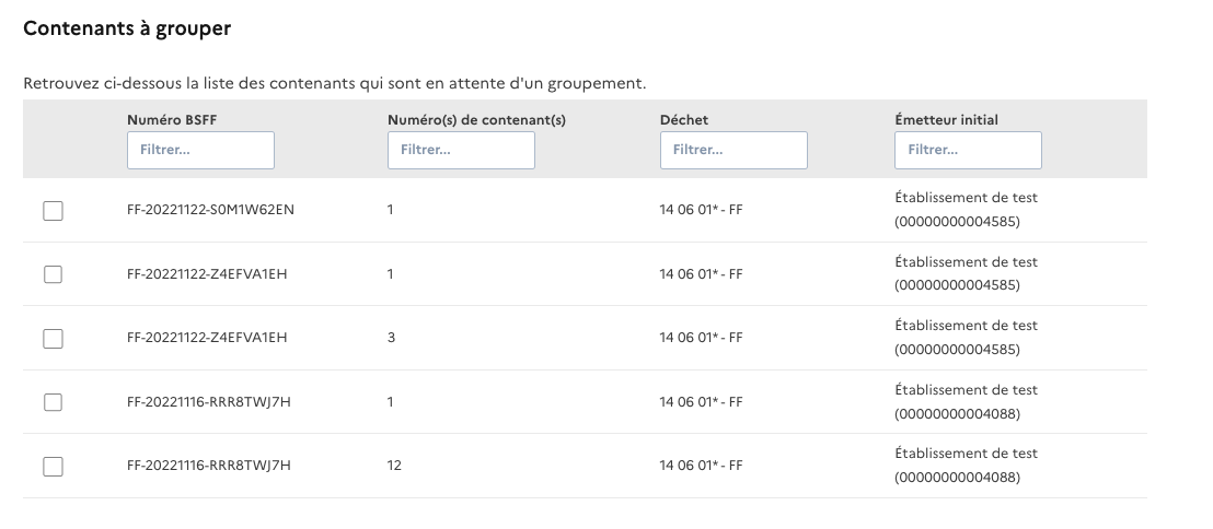 Sélectionnez le ou les contenants de vos BSFF initiaux à associer au BSFF de regroupement dans le tableau. ⚠ Seuls des contenants associés au même code déchet peuvent être regroupés dans un même BSFF de regroupement.