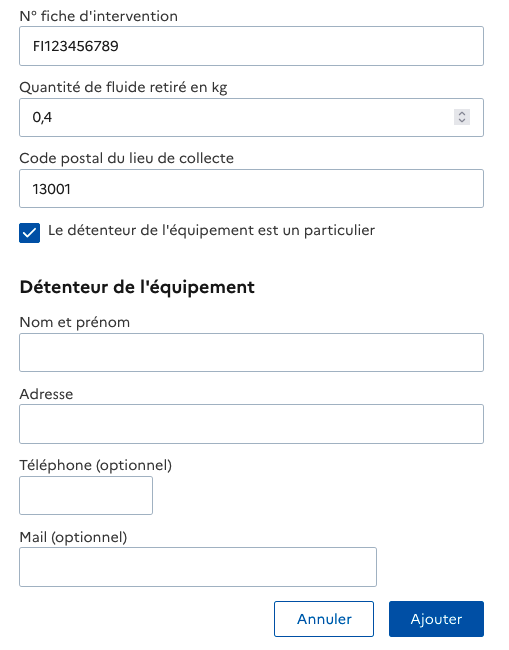 Dans ce cas, veuillez cocher la case "*Le détenteur de l'équipement est un particulier"* lors de l'ajout des informations de la fiche d'intervention :&#x20;
